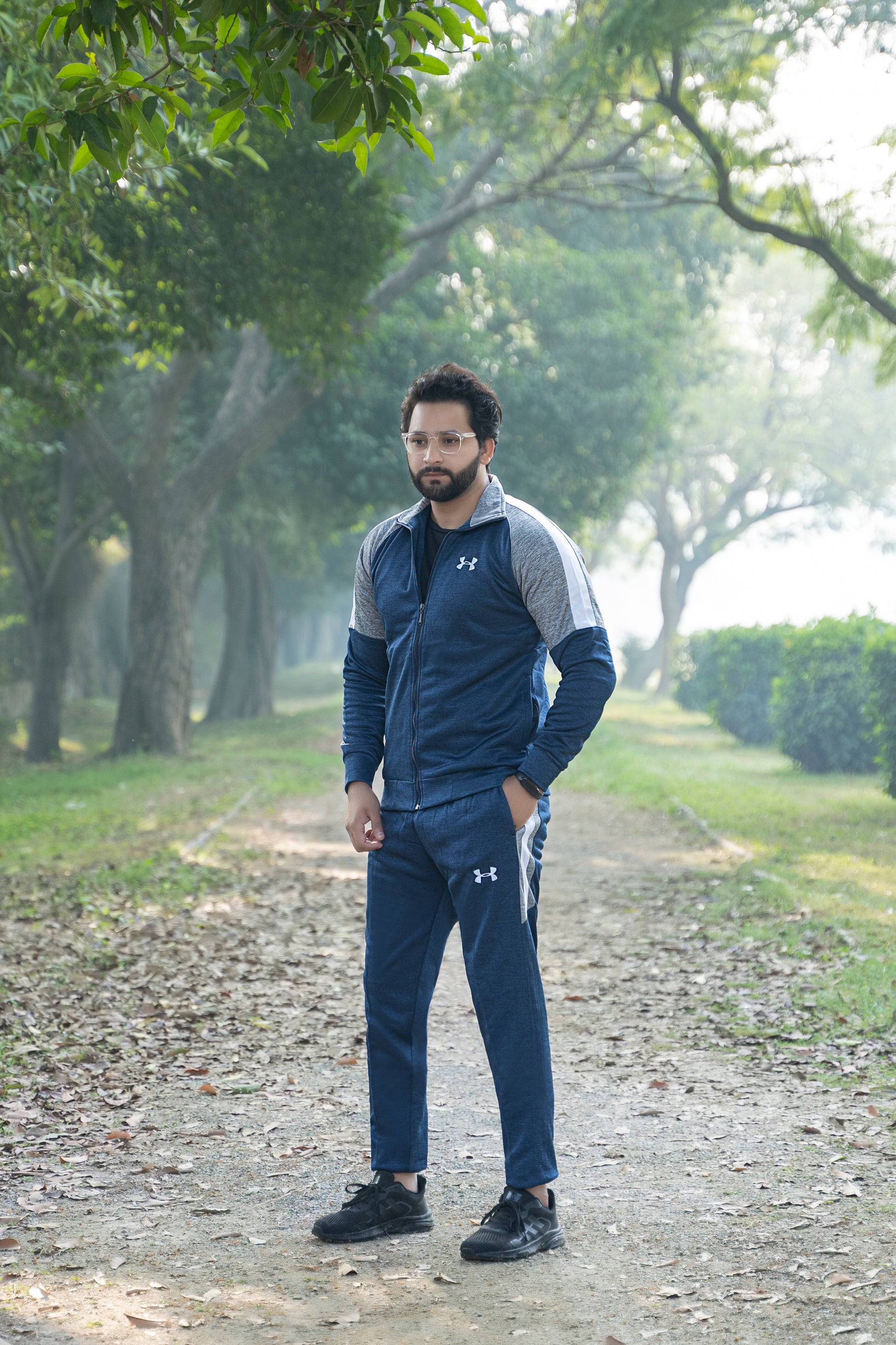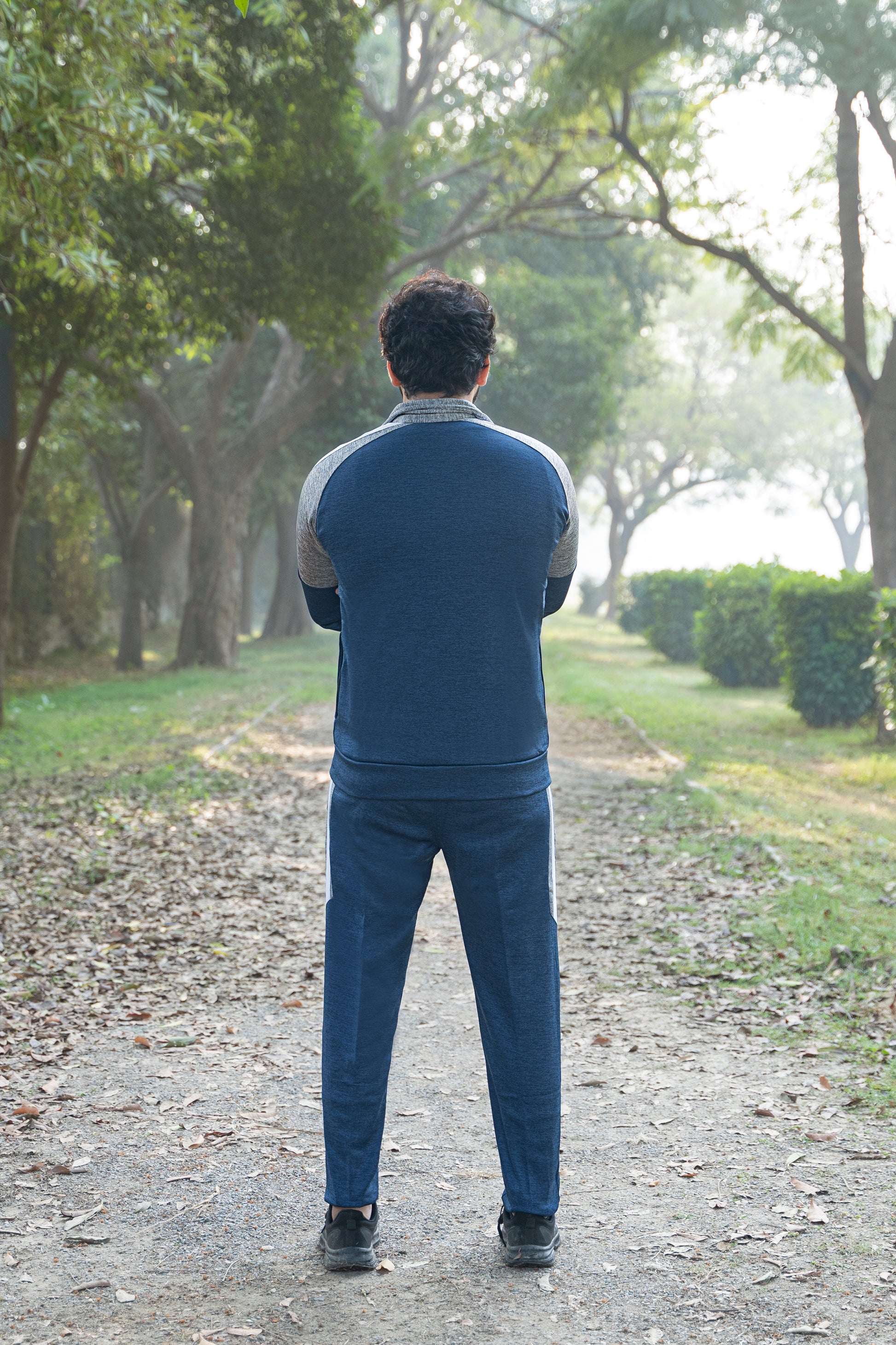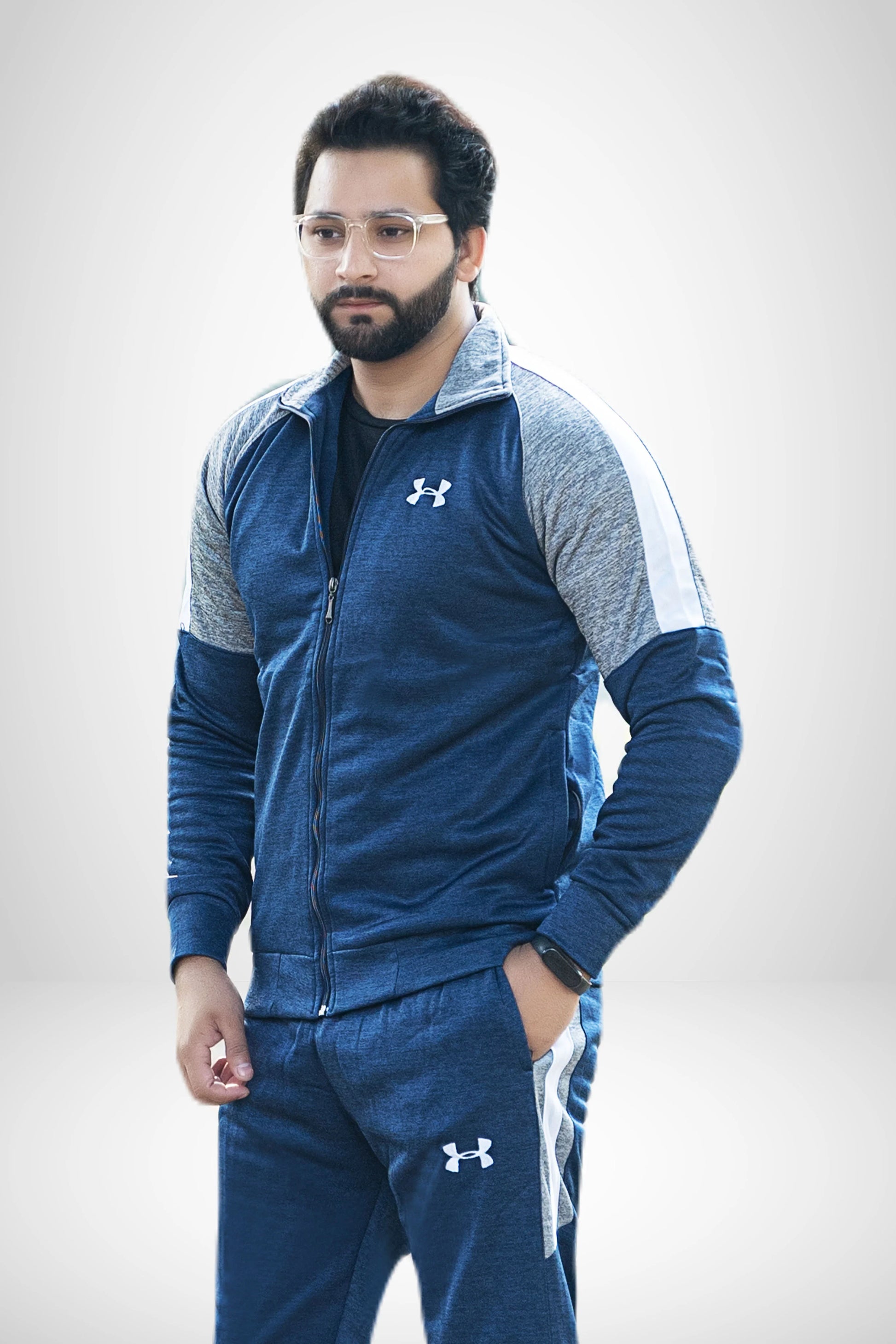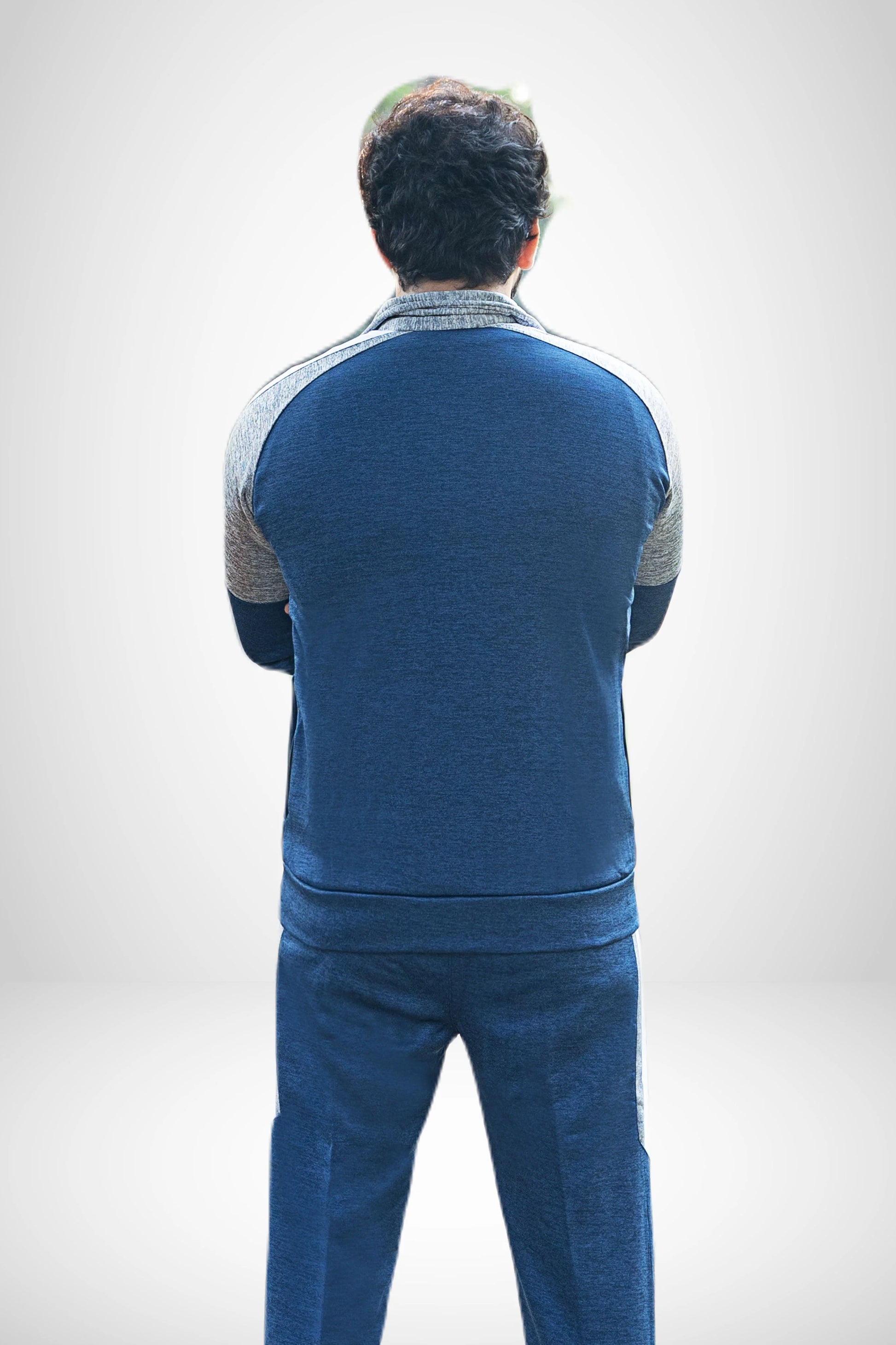 Designed for active lifestyles, this stretchable ensemble features Comfort Flex technology for optimal body stretch. The slim-fit design, enhanced by a standing collar, is crafted from heavy-stretch poly athletic fabric for maximum comfort and flexibility. The classic track jacket and trouser combination is equipped with front pockets, ribbed cuffs, and hem, creating a stylish yet functional look.
